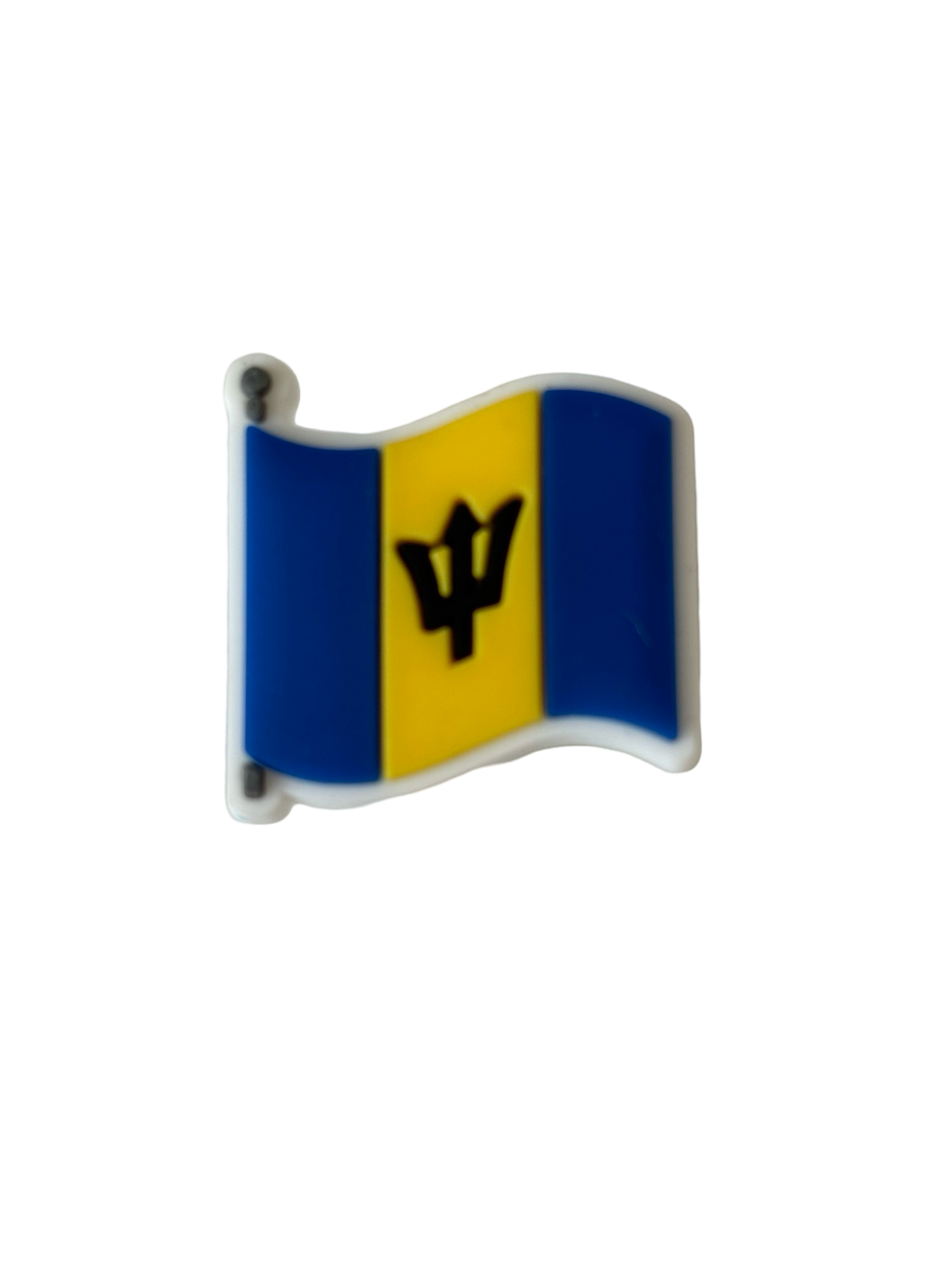 This croc charm features the iconic flag of Barbados, adding a touch of national pride to your footwear. Made with high quality materials, it is a durable and stylish accessory that showcases your love for the country. Perfect for both locals and tourists alike, this charm is a must-have for any croc lover.