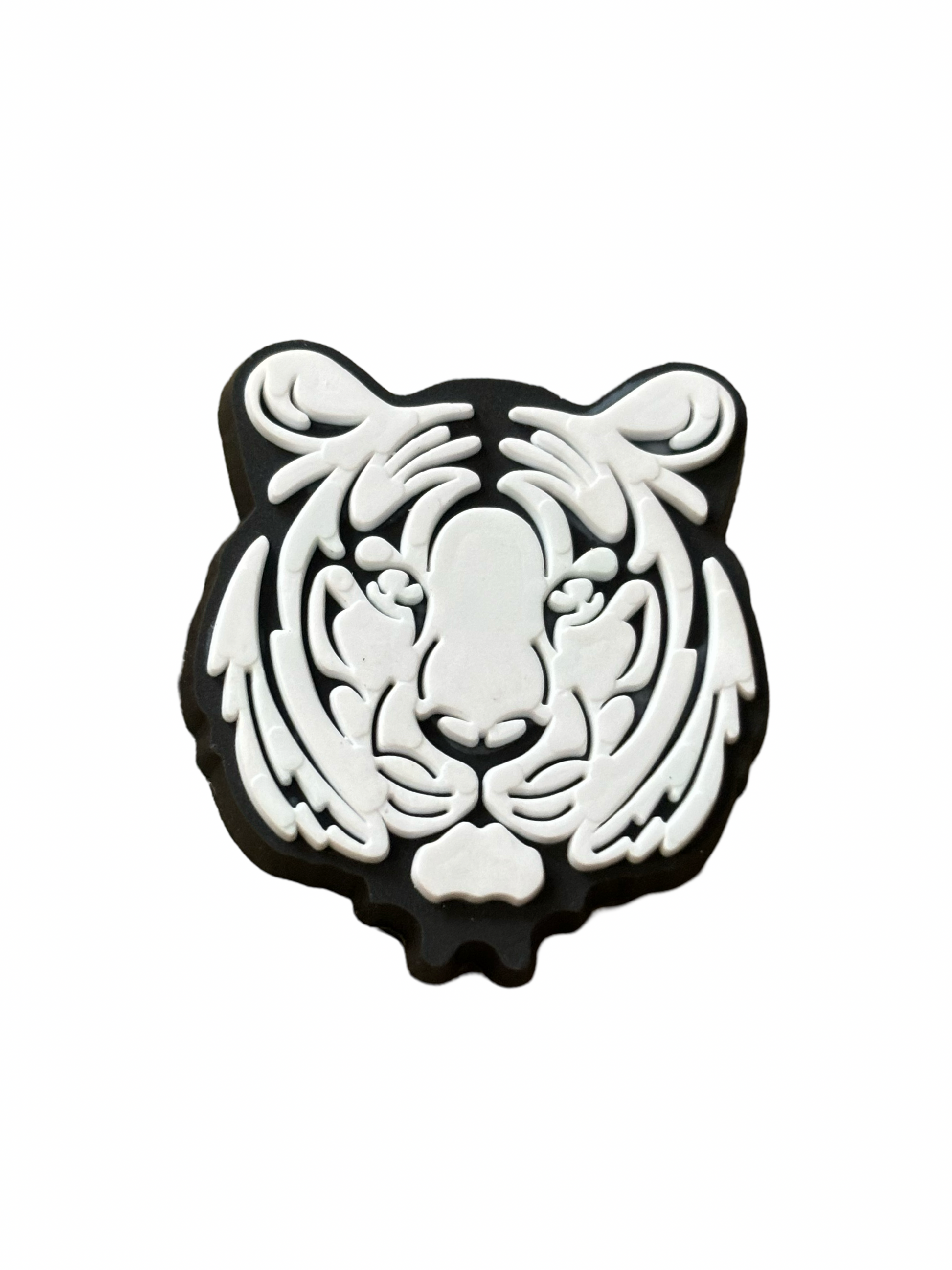 Add a fierce touch to your shoe collection with the Black & White Tiger Croc Charm. Made of durable material, this croc shoe charm will elevate your style and add a unique flair to your outfit. Show off your wild side with this one-of-a-kind accessory.