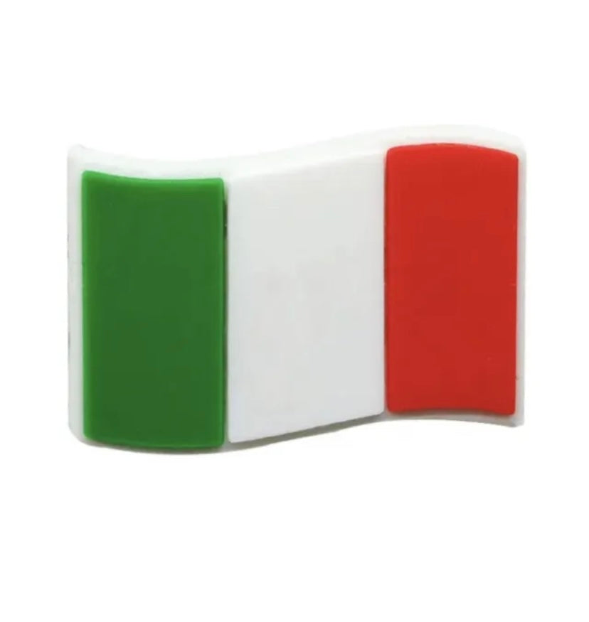 Enhance your Croc shoes with our high-quality Italian flag charm. This charm features the iconic tricolor design and adds a touch of national pride to your footwear. Made with durable materials, it is a must-have accessory for any Italian or admirer of Italy.