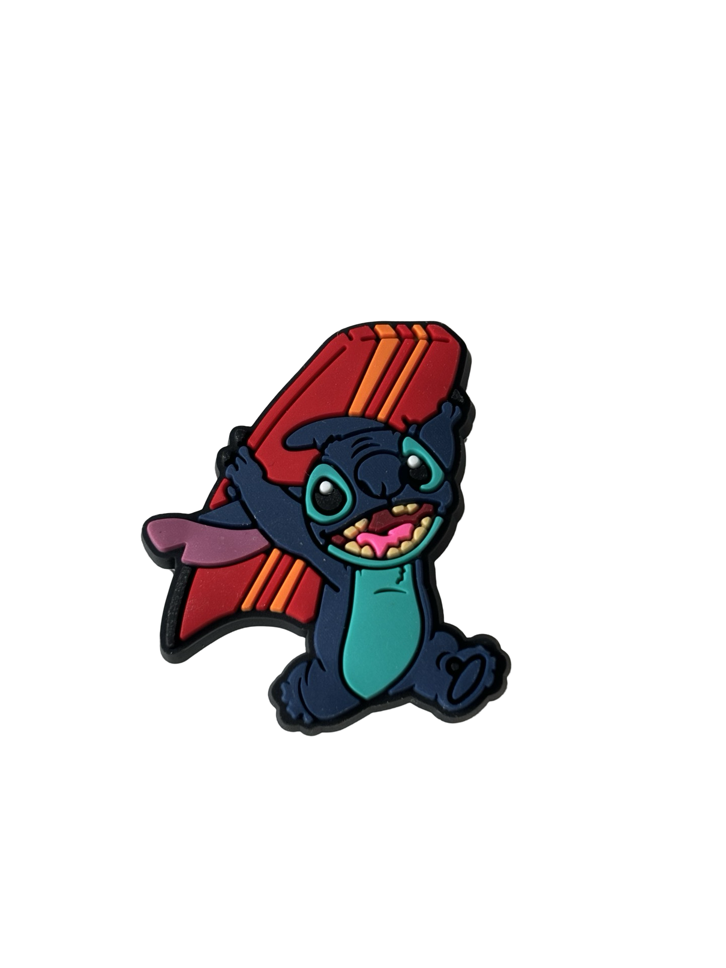 Add some fun to your shoes with the Lilo & Stitch croc charm. Made for surfing enthusiasts, this adorable charm features Lilo and Stitch riding a wave. Simply clip it onto your shoe for a unique touch that will make you stand out on the beach or the boardwalk.