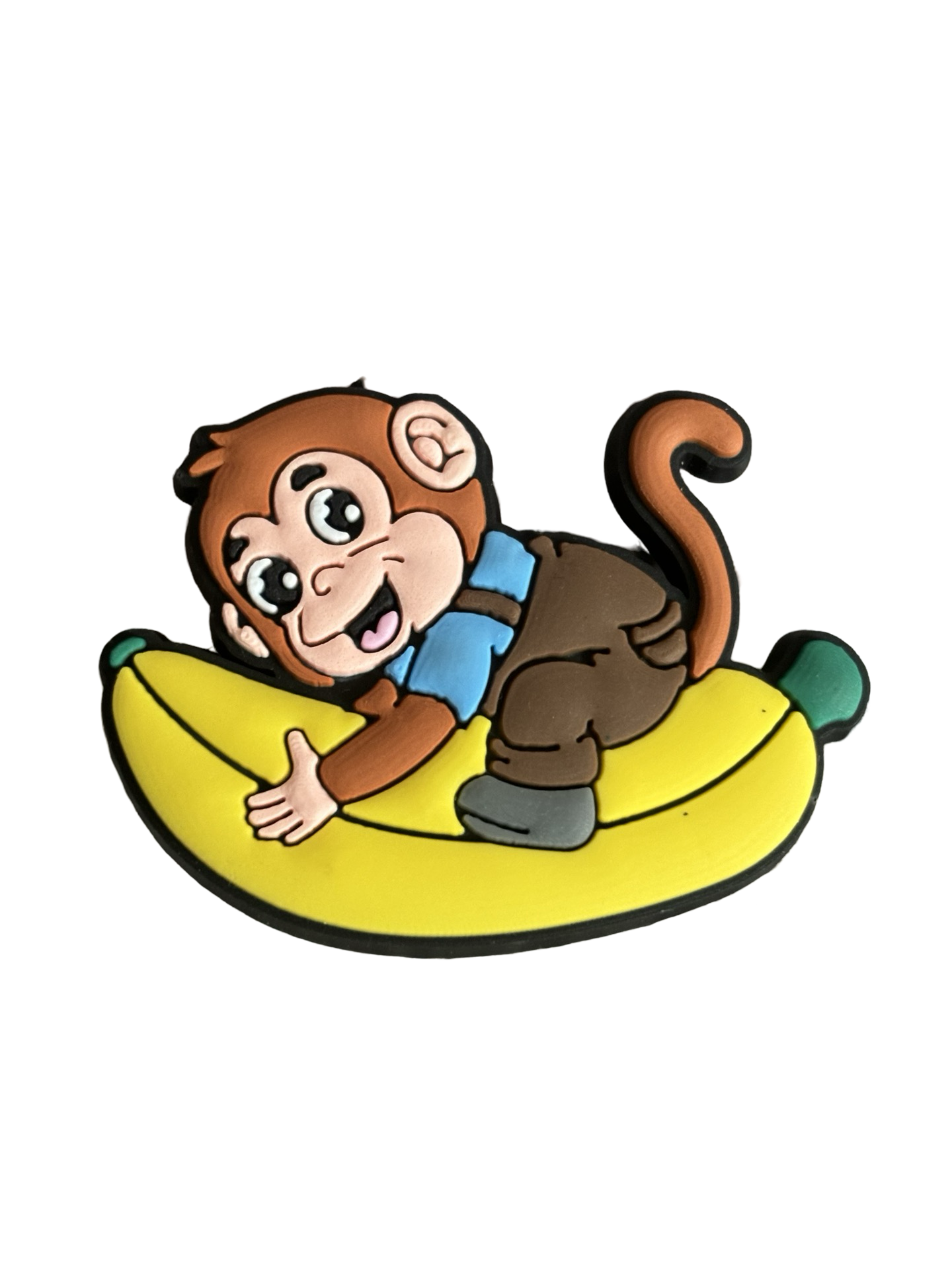 Add a playful touch to your shoes with our Monkey & Banana Croc Charm! Made of high quality materials, this charm features a cute monkey holding a banana on top of a croc shoe. Perfect for animal lovers and those who love to add a little fun to their accessories.
