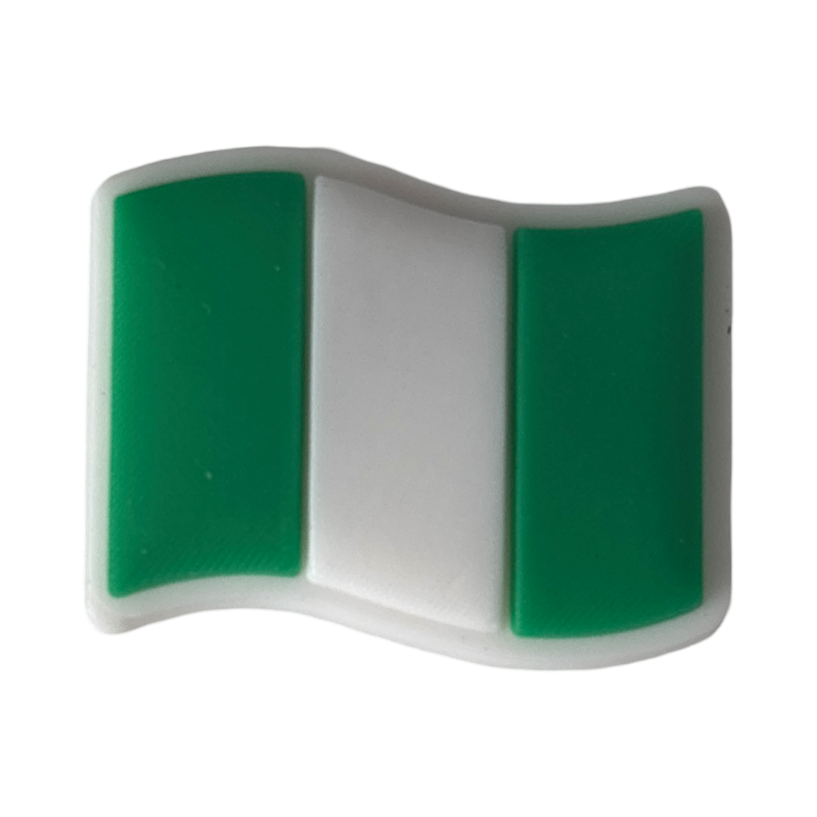 Enhance your shoe game with the Nigeria Flag Croc Charm. This unique charm features the flag of Nigeria, allowing you to proudly show your heritage and style. Made to fit croc shoes, it adds a touch of personality and cultural representation to your footwear. Upgrade your shoe collection with this statement piece.