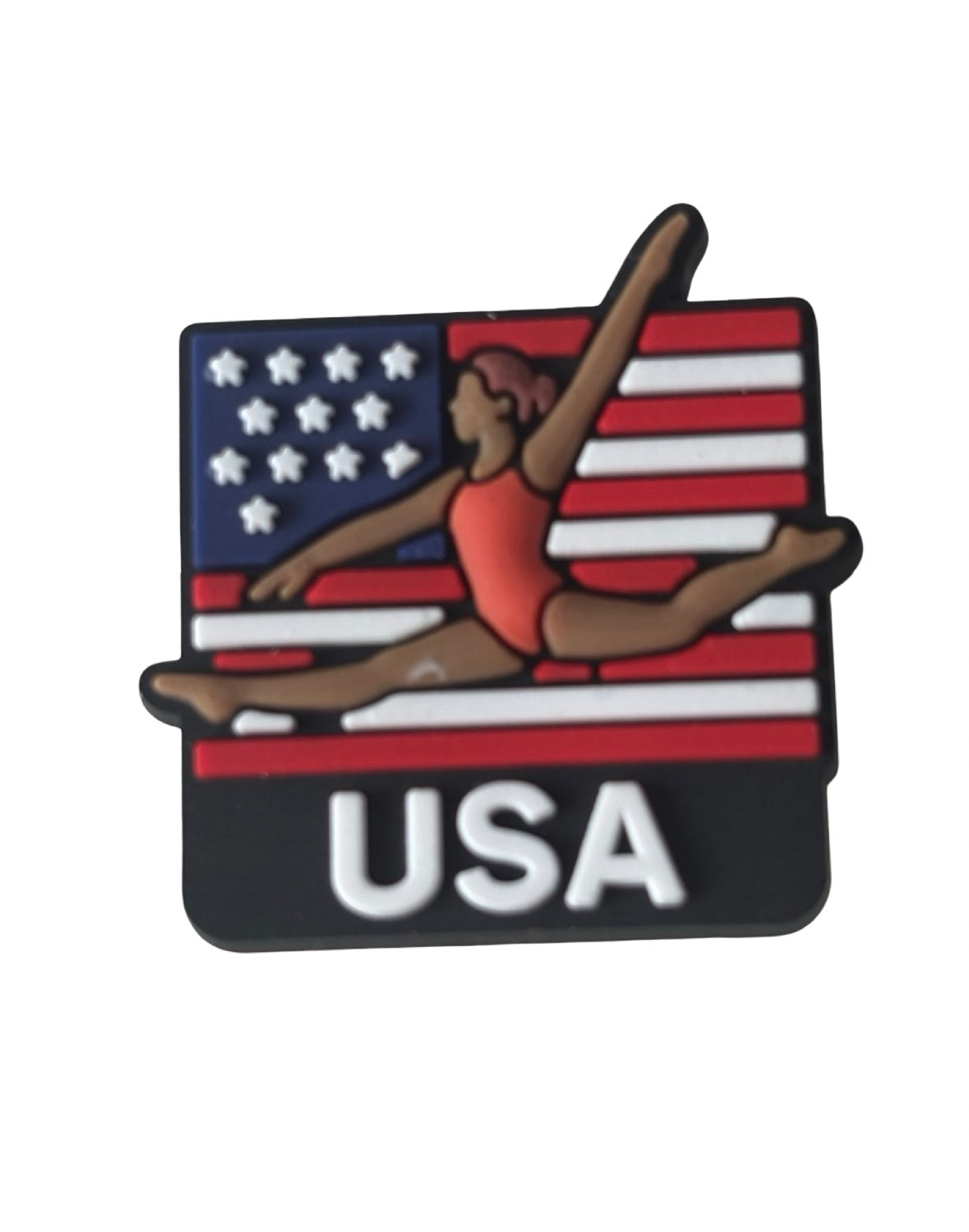 Add some flair to your shoes with the USA Gymnastics Croc Charm! This unique charm easily attaches to any Croc shoe, providing a fun and personalized touch. Made with high-quality materials and featuring the iconic USA Gymnastics logo, this charm is a must-have for any gymnastics enthusiast. Upgrade your shoe game today!