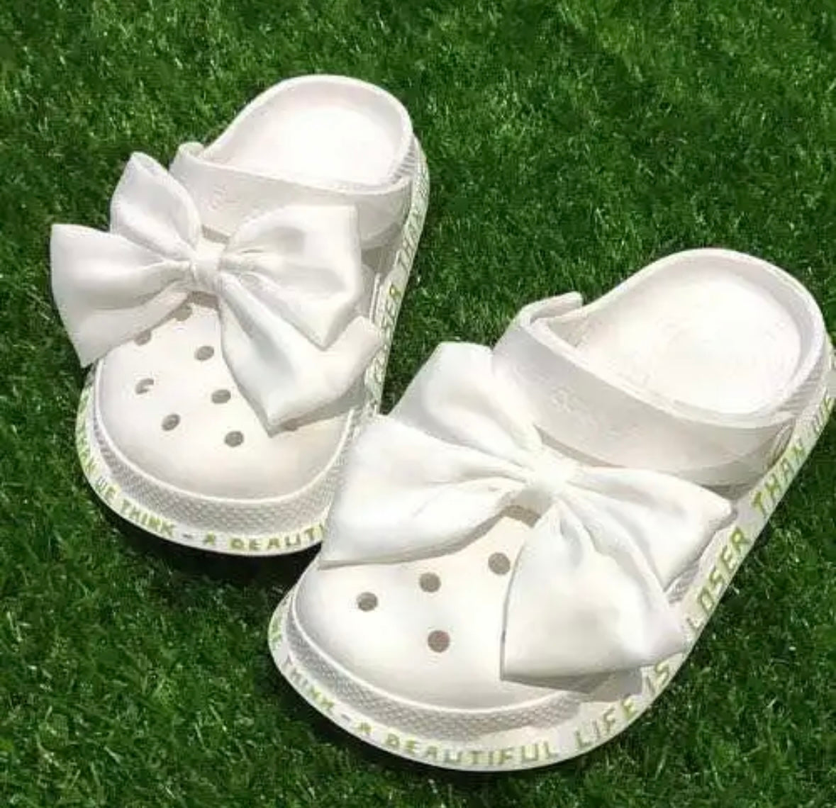 Elevate your shoe game with our White Bows Croc Charms. This set of 2 charms adds a touch of elegance to any pair of crocs. Made of high-quality materials, these white bow charms are durable and easy to attach. Enhance your style and stand out from the crowd with these chic croc charms.
