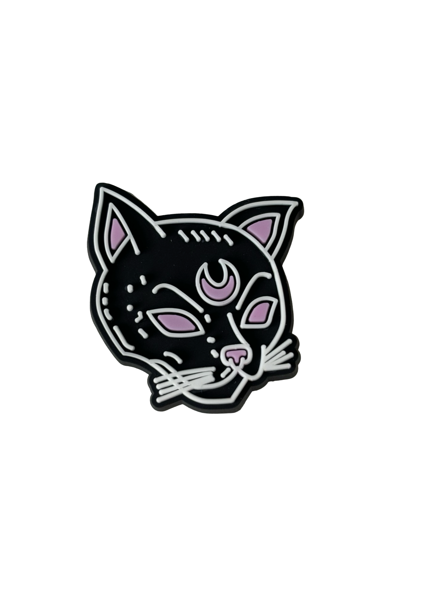 Add a playful touch to your shoes with our Witches Cat Croc Charm. Featuring a charming black cat design, this shoe charm is perfect for any witch lover. Made to easily attach to your croc shoes, it's a fun and unique way to show off your love for cats and Halloween.